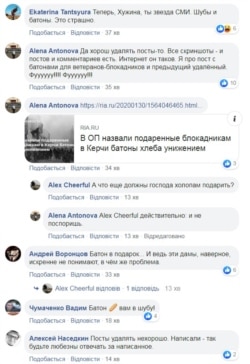 На странице Маи Хужиной в Фейсбуке пользователи оставили более 500 комментариев, в которых высмеивали шубы чиновниц и отмечали скудность подарков, с которыми «единоросы» пришли к пожилым керчанам. Поначалу Хужина отвечала на критику, называя комментаторов «ботами», но позднее удалила свое сообщение вместе со всем обсуждением.