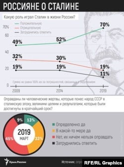 При этом мнение о неоправданности «человеческих жертв, которые понес советский народ в сталинскую эпоху», разделяют 45% россиян, а в 2008 году так считали 60% опрошенных. В 2019-м об отрицательной роли Сталина в истории России заявили 19% респондентов, причем 14% негативно относятся к Сталину, испытывая раздражение, страх или отвращение.