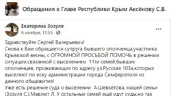 О грядущем выселении из общежития российскому главе Крыма Сергею Аксенову жалуется супруга бывшего ополченца, участника «крымской весны» Екатерина Зозуля. Она просит его «помочь в решении ситуации».